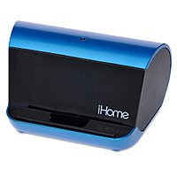 Share your sounds anywhere with the iHM9 portable speaker system. The contemporary space saving design fi ts anywhere, and looks great. Enjoy big stereo sound from a small unit. Built in audio cable lets you connect to any audio device that has a headphone jack. Blue.