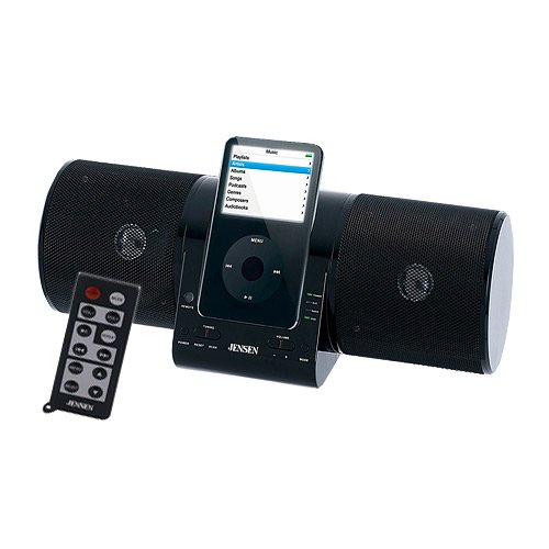 This speaker system connects to your MP3 player, iPod, or other device using a standard 3.5-mm connector. You could even use it to amplify laptops or other devices. Just plug the attached audio patch cord located on the back of the unit into the headphone or line-out jack on your player, and you're set.